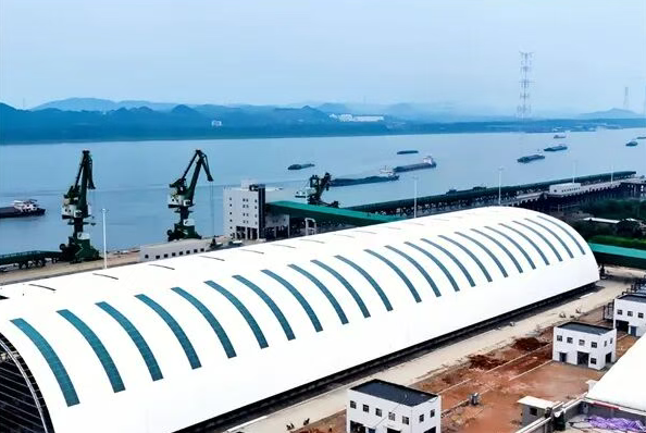 1號(hào)貨棚是保障港口散貨存儲(chǔ)、轉(zhuǎn)運(yùn)功能的核心構(gòu)筑物,其規(guī)模宏大,結(jié)構(gòu)復(fù)雜。網(wǎng)架結(jié)構(gòu)橫跨66米,縱深達(dá)214.5米,高25.15米,主體結(jié)構(gòu)設(shè)計(jì)工作年限達(dá)50年。此次完工涵蓋了從主體鋼網(wǎng)架到屋面彩板及采光帶的全部工程,相當(dāng)于在一片廣闊的場(chǎng)地上精準(zhǔn)構(gòu)筑起一座“鋼鐵蒼穹”,其宏大的體量與完備的功能將為港區(qū)每年2780萬(wàn)噸吞吐量目標(biāo)提供核心硬件支撐。
