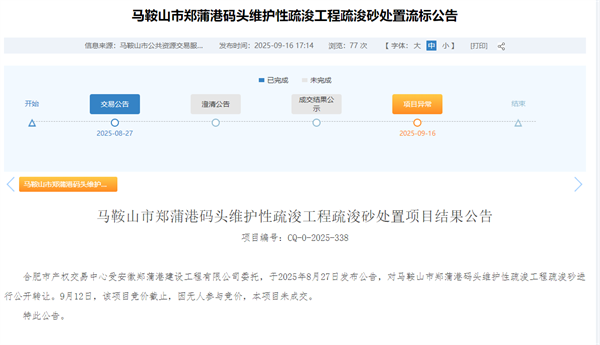 近日,安徽馬鞍山市公共資源交易服務中心發(fā)布鄭蒲港碼頭維護性疏浚工程疏浚砂處置交易流拍公告。據(jù)悉,該項目預估量為40.21萬噸,轉讓總價為522.73萬元,評估值13元/噸(不含稅)。因無人參與競價,該項目流拍。