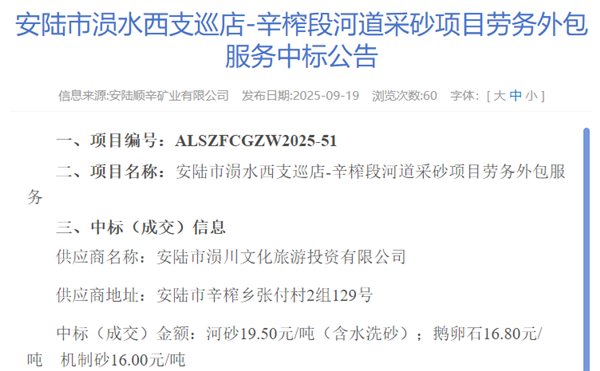 日前,湖北省孝感市安陸市人民政府發(fā)布安陸市涢水西支巡店-辛榨段河道采砂項(xiàng)目勞務(wù)外包服務(wù)中標(biāo)公告。安陸市涢川文化旅游投資有限公司成功中標(biāo)該項(xiàng)目,中標(biāo)(成交)金額分別為河砂19.5元/噸(含水洗砂)、鵝卵石16.8元/噸、機(jī)制砂16元/噸。根據(jù)公告,該項(xiàng)目不屬于政府采購(gòu)。合同履行期限為生效后3年,分三年簽訂服務(wù)合同。