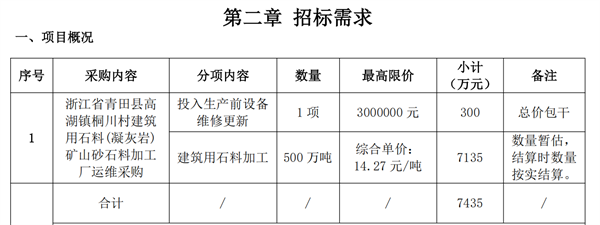 近日,浙江麗水市公共資源交易中心發(fā)布浙江省青田縣高湖鎮(zhèn)桐川村建筑用石料(凝灰?guī)r)礦山砂石料加工廠運(yùn)維采購中標(biāo)結(jié)果。民企寧波銘滇建筑工程有限公司以投入生產(chǎn)前設(shè)備維修更新60萬元、建筑用石料加工6400萬元中標(biāo)該項(xiàng)目。按照招標(biāo)公告暫估數(shù)量500萬噸來計(jì)算,該項(xiàng)目加工中標(biāo)單價(jià)12.8元/噸。