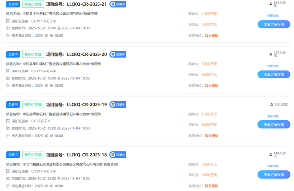 近日,山西呂梁市規(guī)劃和自然資源局集中發(fā)布12宗砂石類采礦權掛牌出讓公告。項目均為整合區(qū)塊內新增、空白資源,覆蓋交口(4宗)、中陽(3宗)、孝義(2宗)、離石、柳林、交城各1宗等6個縣區(qū),涉及白云巖、石灰?guī)r兩大主流礦種。合計資源儲量13.6億噸,掛牌起始價10.59億元,均價約0.78元/噸。