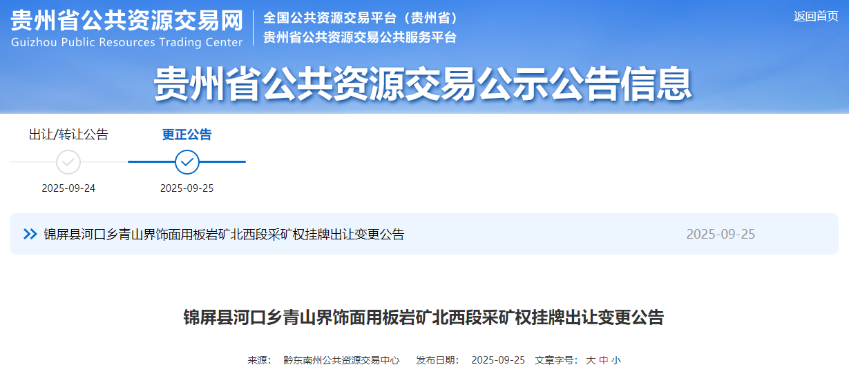 9月24日,貴州省公共資源交易網(wǎng)發(fā)布黔東南州錦屏縣河口鄉(xiāng)青山界飾面用板巖礦北西段采礦權(quán)掛牌出讓公告。該礦總資源量(探明+控制+推斷)2423.19萬方(6639.54萬噸),出讓年限30年,建議礦山設計規(guī)模不低于80萬方/年,掛牌起始價1.2億元,額外費用超406萬元,資源價款超1.86元/噸。