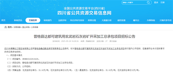 近日,四川省公共資源交易信息網發(fā)布涼山州普格縣達都可建筑用玄武巖石灰?guī)r礦開采加工總承包項目招標公告,預算金額最高限價玄武巖綜合單價35元/噸,石灰?guī)r綜合單價33元/噸,不接受聯(lián)合體投標。