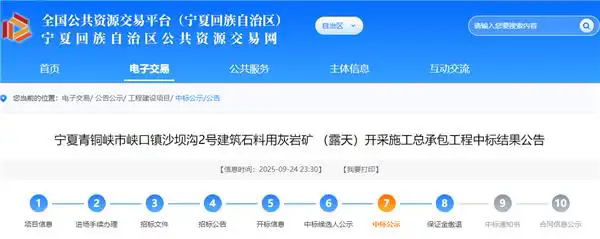 9月24日,內(nèi)蒙古康寧礦業(yè)股份有限公司成功中標寧夏青銅峽市峽口鎮(zhèn)沙壩溝2號建筑石料用灰?guī)r礦(露天)開采施工總承包工程,中標價7.21元/噸。該項目采礦工程量200萬-300萬噸/年,計劃工期11.5年..
