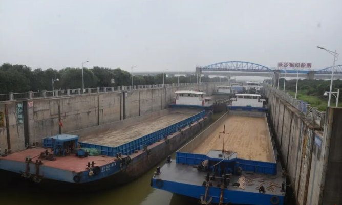 圖為沅水籍?dāng)?shù)艘返程砂石運(yùn)輸空船,通過湘江長(zhǎng)沙樞紐船閘下駛。