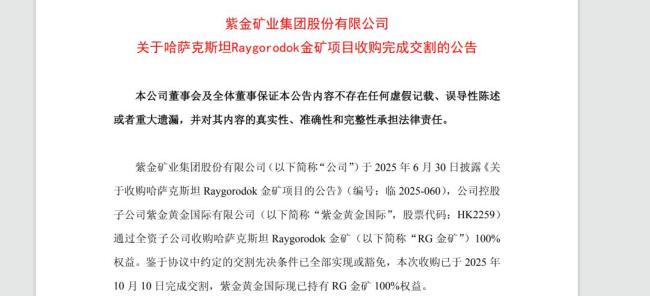 10月12日晚,紫金礦業(yè)(601899.SH、02899.HK)發(fā)布公告,再度加碼中亞,拿下哈薩克斯坦Raygorodok金礦100%權(quán)益。根據(jù)公告,收購已于2025年10月10日完成交割。RG金礦在2023-2024年間年均產(chǎn)金約6噸,目前生產(chǎn)運(yùn)營正常且有提升空間,有望顯著支撐公司2028年礦產(chǎn)金100-110噸的規(guī)劃目標(biāo)。此次收購使紫金黃金國際旗下在產(chǎn)黃金礦山增至9座。