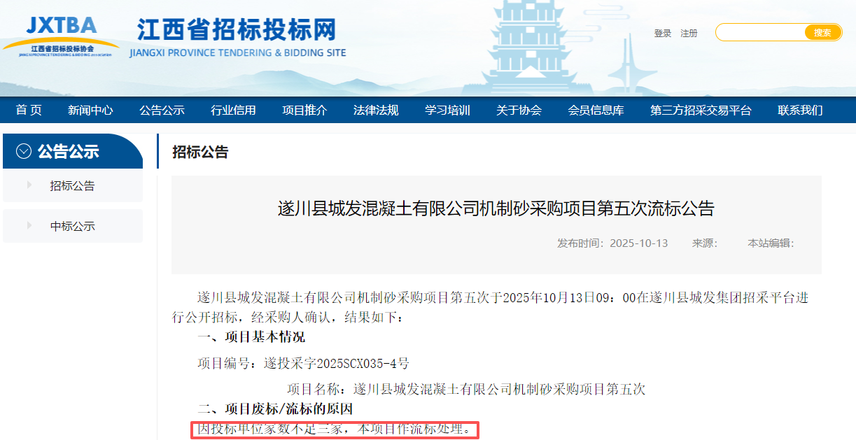 近日,江西省招標投標網發(fā)布遂川縣城發(fā)混凝土有限公司機制砂采購項目第五次流標公告。因投標單位家數不足三家,本項目作流標處理。