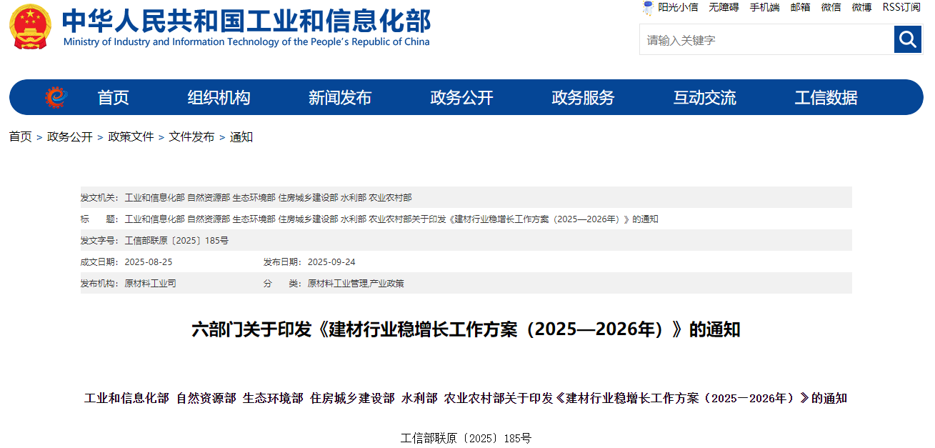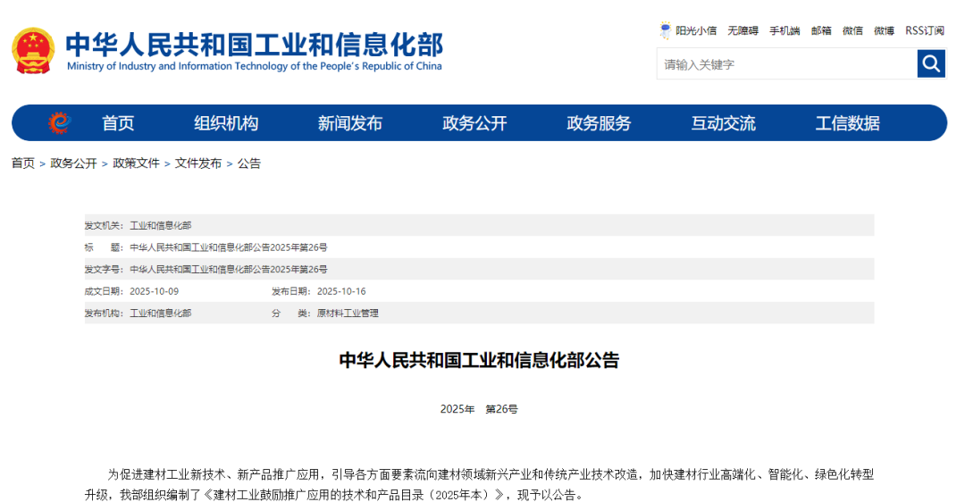 10月16日,工業(yè)和信息化部于正式公布《建材工業(yè)鼓勵(lì)推廣應(yīng)用的技術(shù)和產(chǎn)品目錄(2025 年本)》(以下簡稱《目錄》),標(biāo)志著我國建材行業(yè)在高端化、智能化、綠色化轉(zhuǎn)型道路上邁出關(guān)鍵一步。..