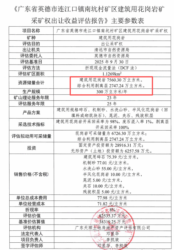 據(jù)悉,截至評估基準日2025年9月30日,廣東省英德市連江口鎮(zhèn)南坑村礦區(qū)建筑用花崗巖礦保有建筑用花崗巖礦7560.30萬立方米,其中,控制資源量6411.07萬立方米、推斷資源量1149.23萬立方米。綜合利用剝離層2747.24萬立方米,其中:殘坡積層387.22萬立方米、全風化花崗巖1265.07萬立方米、半風化花崗巖1026.77萬立方米、夾石68.18萬立方米。