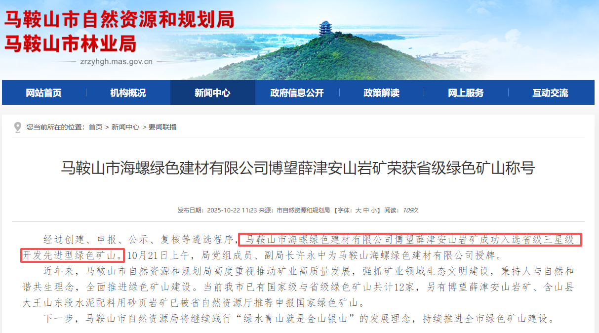 近日,經(jīng)過創(chuàng)建、申報(bào)、公示、復(fù)核等遴選程序,馬鞍山市海螺綠色建材有限公司博望薛津安山巖礦被正式授牌省級三星級“開發(fā)先進(jìn)型綠色礦山”。