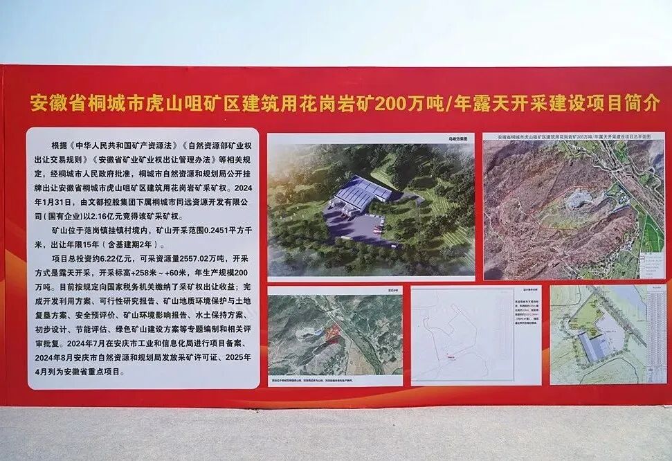 據(jù)悉,桐城市虎山咀礦區(qū)建筑用花崗巖礦由文都控股集團(tuán)下屬公司——桐城市同遠(yuǎn)資源開發(fā)有限公司(國有企業(yè))以2.16億元競得采礦權(quán)。礦山位于范崗鎮(zhèn)掛鎮(zhèn)村境內(nèi),礦山開采范圍0.2451平方千米,開采方式是露天開采,開采標(biāo)高+258米~+60米。今年4月列為安徽省重點(diǎn)項(xiàng)目。