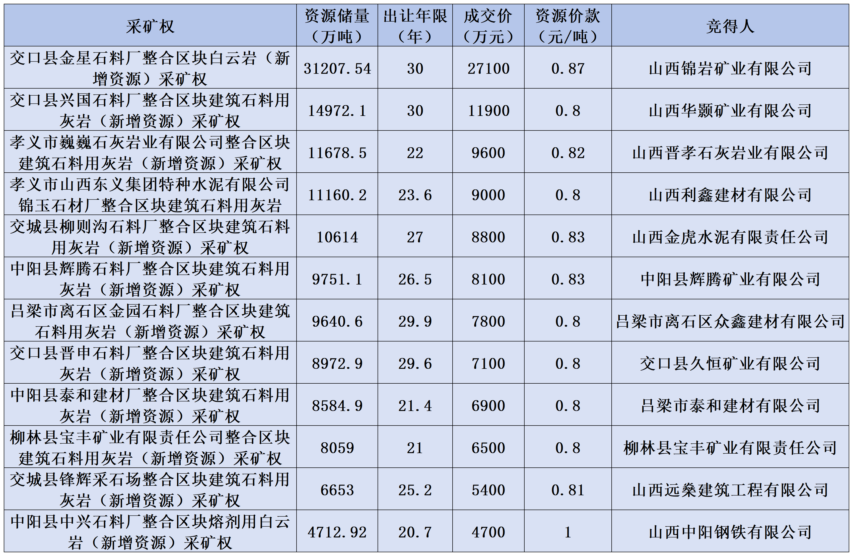 3、孝義市巍巍石灰?guī)r業(yè)有限公司整合區(qū)塊建筑石料用灰?guī)r(新增資源)采礦權位于孝義市南陽鄉(xiāng)西田莊村,礦區(qū)面積0.9391平方公里,資源儲量近1.17億噸,擬出讓年限22年。山西晉孝石灰?guī)r業(yè)有限公司以9600萬元競得該礦權,礦山資源價款約0.82元/噸。