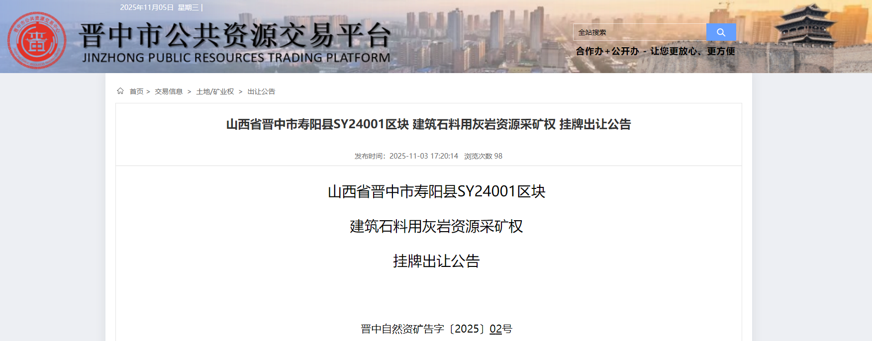 近日,晉中市規(guī)劃和自然資源局發(fā)布壽陽縣SY24001區(qū)塊建筑石料用灰?guī)r資源采礦權(quán)出讓公告。