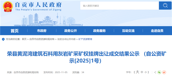 10月5日,四川省自貢市榮縣黃泥灣建筑石料用灰?guī)r礦采礦權被當地國企——自貢榮州自然資源發(fā)展有限公司成功競得。該礦資源儲量3286.2萬噸,出讓年限15年,成交價4471.26萬元。經測算,該礦資源價款約1.36元/噸,生產規(guī)模超200萬噸/年。