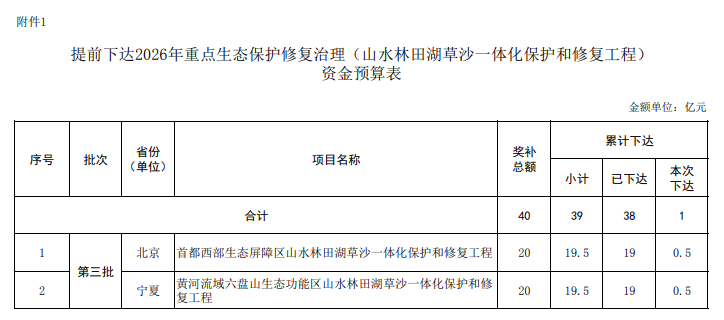 1.提前下達2026年重點生態(tài)保護修復(fù)治理(山水林田湖草沙一體化保護和修復(fù)工程)資金預(yù)算表