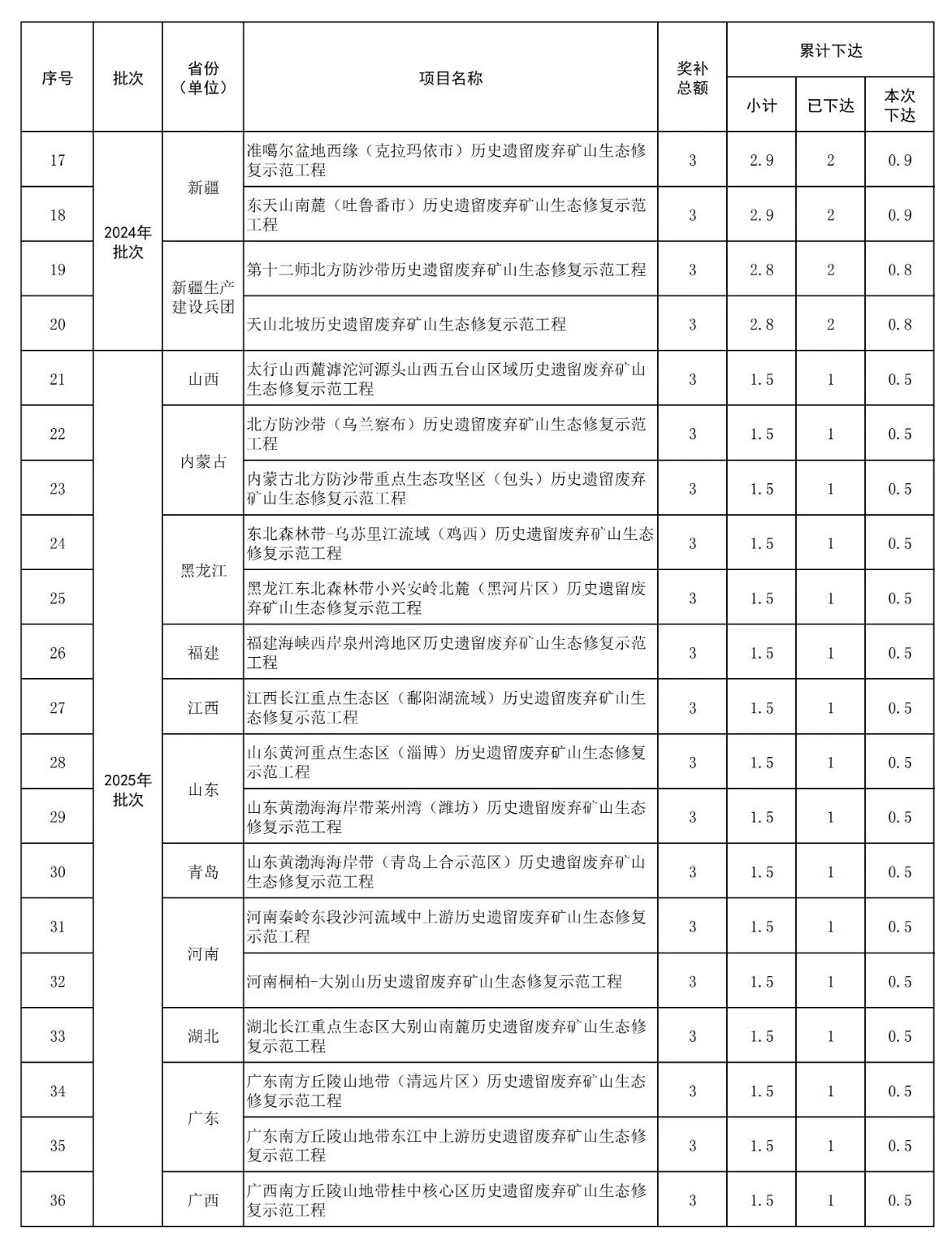 據(jù)悉,2026年重點生態(tài)保護修復(fù)治理(歷史遺留廢棄礦山生態(tài)修復(fù)示范工程)共涉及山西、內(nèi)蒙古、山東、西藏、甘肅、新疆、新疆生產(chǎn)建設(shè)兵團等7地區(qū),預(yù)算金額33億元,本次下達金額11億元。