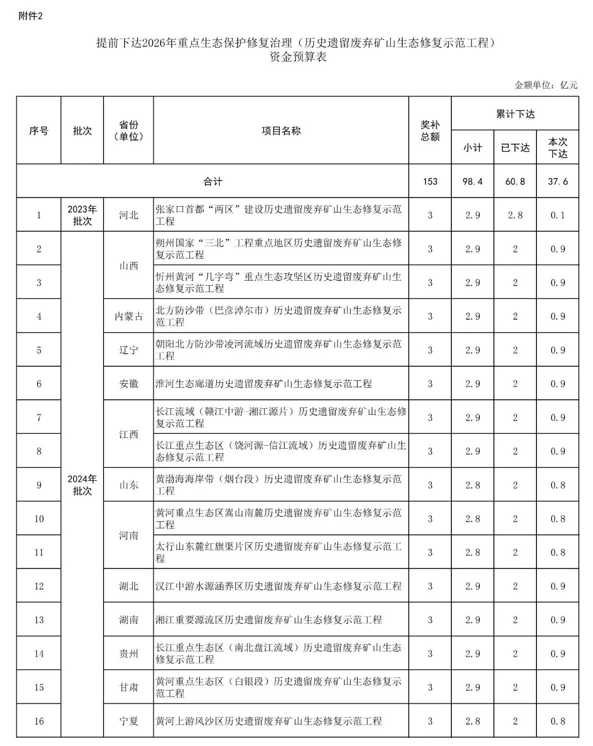 附件2 提前下達2026年重點生態(tài)保護修復(fù)治理(歷史遺留廢棄礦山生態(tài)修復(fù)示范工程)資金預(yù)算表