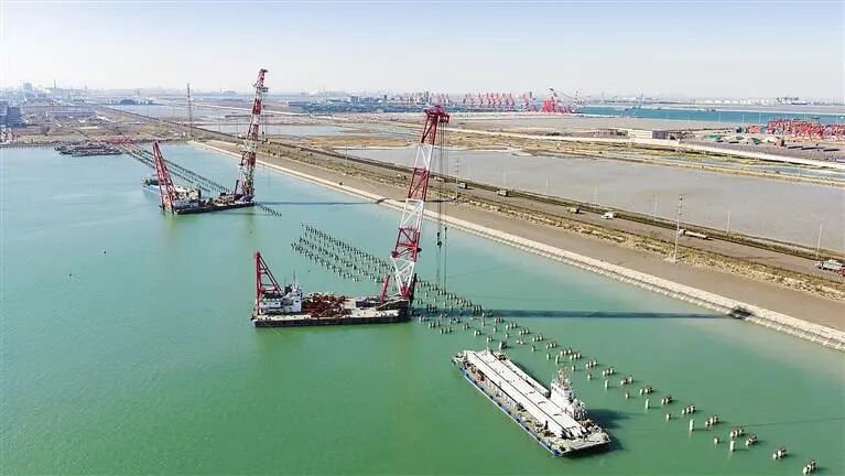 日前,在國能黃驊港務(wù)有限責(zé)任公司五期工程建設(shè)現(xiàn)場,多艘大型工程船舶協(xié)同作業(yè)、各司其職:打樁船憑借精準(zhǔn)的定位技術(shù),將一根根樁基穩(wěn)穩(wěn)“植入”海床,為碼頭筑牢根基;浮吊船與運(yùn)輸駁船緊密配合,高效運(yùn)送碼頭建設(shè)所需的各類構(gòu)件,施工現(xiàn)場一派熱火朝天的建設(shè)景象。