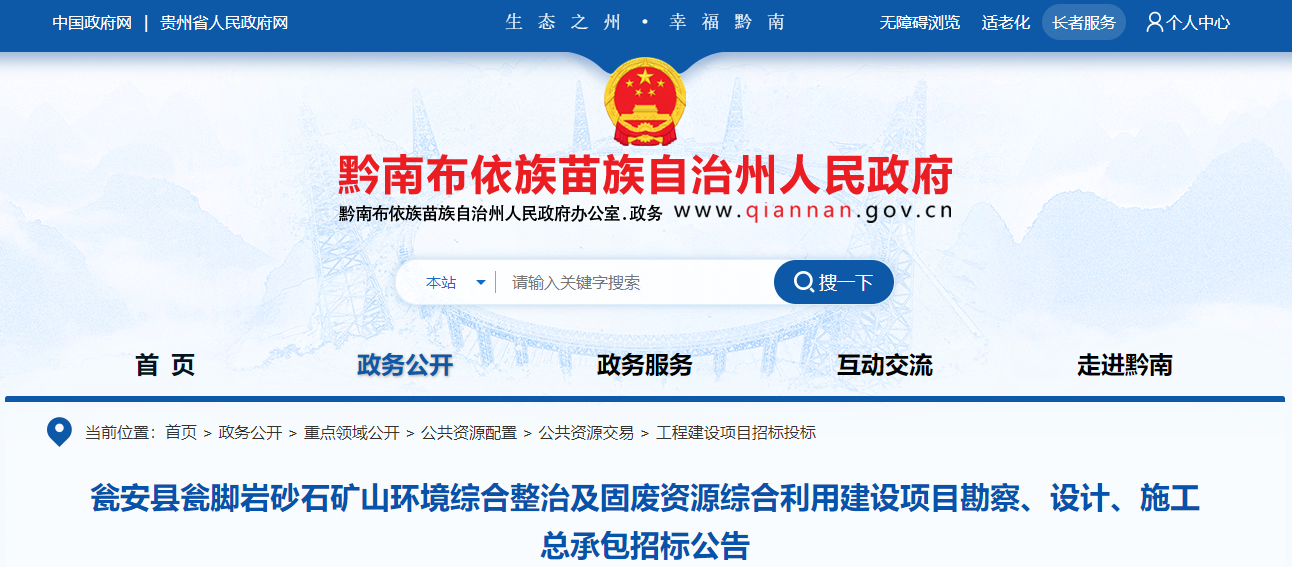 近日,貴州黔南布依族苗族自治州人民政府發(fā)布甕安縣甕腳巖砂石礦山環(huán)境綜合整治及固廢資源綜合利用建設(shè)項(xiàng)目勘察、設(shè)計(jì)、施工總承包招標(biāo)公告。