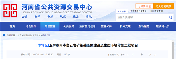 12月1日,河南省公共資源交易中心發(fā)布衛(wèi)輝市南寺白云巖礦基礎(chǔ)設(shè)施建設(shè)及生態(tài)環(huán)境修復(fù)工程項目招標(biāo)公告,投標(biāo)截止時間為2025年12月23日。