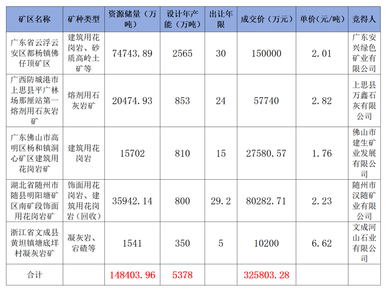 廣東省云浮云安區(qū)都楊鎮(zhèn)佛仔頂?shù)V資源儲量約7.5億噸,生產(chǎn)規(guī)模2600萬噸/年,是5宗礦權中唯一年產(chǎn)能超2000萬噸砂石礦。廣東安興綠色礦業(yè)有限公司(國企)底價15億元競得,單價約2.01元/噸。