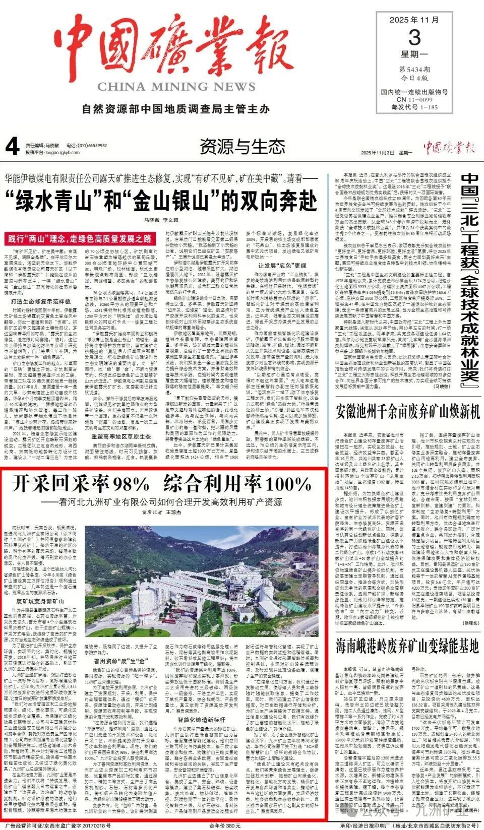 近日,《中國礦業(yè)報》以《開采回采率98%綜合利用率100%——看河北九洲礦業(yè)有限公司如何合理開發(fā)高效利用礦產(chǎn)資源》為題,報道了九洲礦業(yè)在資源開發(fā)與生態(tài)保護方面的創(chuàng)新實踐。文章以詳實的數(shù)據(jù)和生動的案例,展現(xiàn)了九洲礦業(yè)從廢棄采石場到綠色礦山的華麗蛻變,記錄了其在資源利用、生態(tài)修復、智能化建設等方面的卓越成就。報道生動呈現(xiàn)了九洲礦業(yè)在資源高效利用、生態(tài)環(huán)境修復、智能化礦山建設等方面的先進經(jīng)驗,彰顯了企業(yè)踐行綠色發(fā)展理念、推動礦業(yè)高質(zhì)量發(fā)展的責任擔當,也為行業(yè)樹立了資源開發(fā)與環(huán)境保護協(xié)同發(fā)展的標桿。