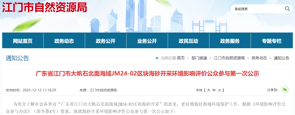 近日,江門市自然資源局發(fā)布廣東省江門市大帆石北面海域JM24-02區(qū)塊海砂開采環(huán)境影響評價公眾參與第一次公示。