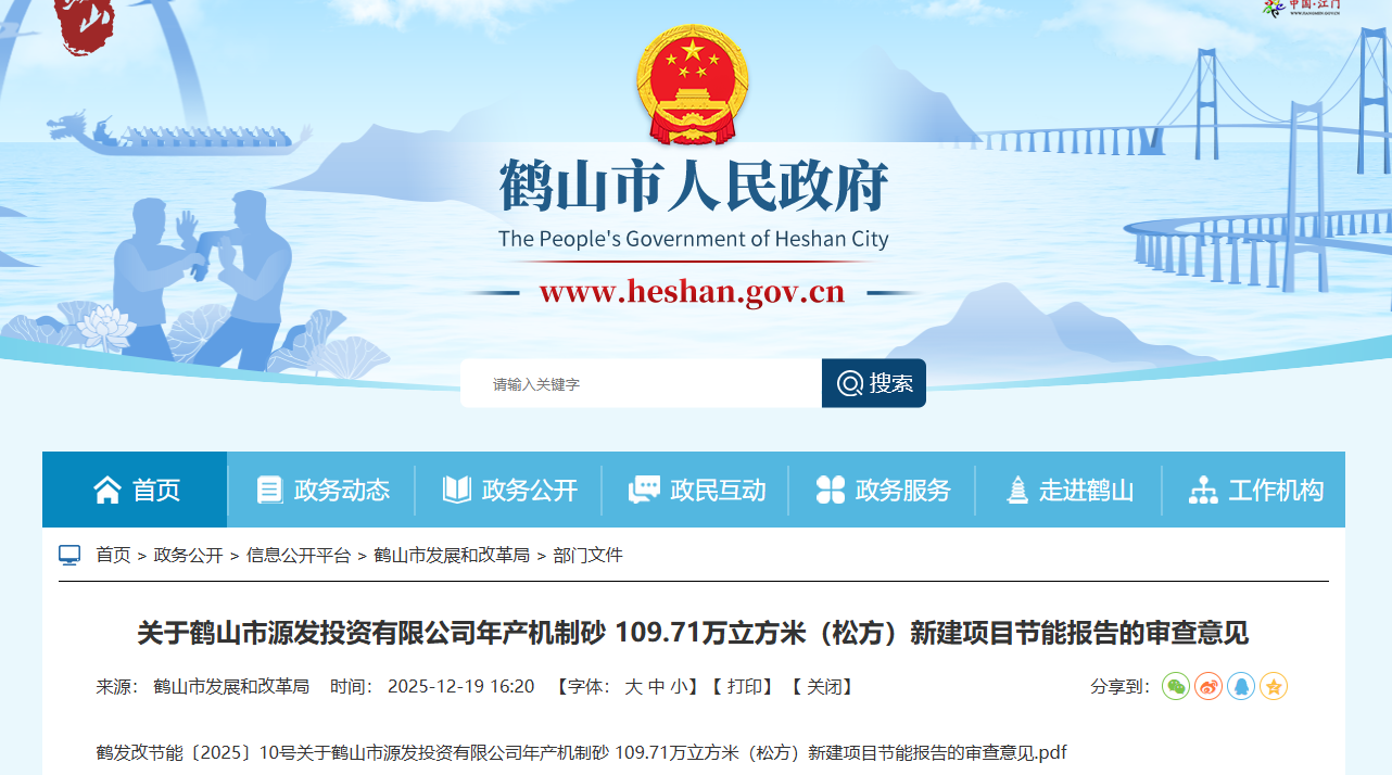 近日,廣東鶴山市發(fā)展和改革局發(fā)布關于鶴山市源發(fā)投資有限公司年產機制砂109.71萬立方米(松方)新建項目節(jié)能報告的審查意見。