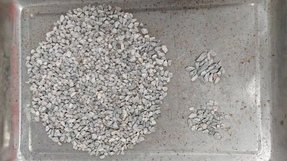 2025年3月,美卓對1# 和2# HP6進(jìn)行骨料級配的取樣測試。在排料口設(shè)定值26mm,傳動軸轉(zhuǎn)速820rpm,襯板磨損58%的狀態(tài)下,1# 機取樣功率約380kW,2# 機取樣功率約320kW。測試結(jié)果顯示,整個針片狀含量在5%以內(nèi),達(dá)到國家一級骨料要求,成品率為98.3%