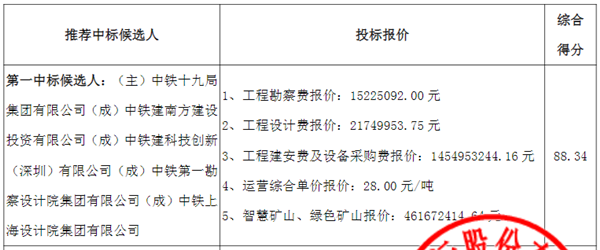 中鐵十九局集團(tuán)有限公司、中鐵建南方建設(shè)投資有限公司、中鐵建科技創(chuàng)新(深圳)有限公司、中鐵第一勘察設(shè)計(jì)院集團(tuán)有限公司、中鐵上海設(shè)計(jì)院集團(tuán)有限公司聯(lián)合體順利中標(biāo)該項(xiàng)目。投標(biāo)報(bào)價(jià)方面,項(xiàng)目工程勘察費(fèi)近1522.51萬(wàn)元、工程設(shè)計(jì)費(fèi)約2175萬(wàn)元、工程建安費(fèi)及設(shè)備采購(gòu)費(fèi)近14.55億元、運(yùn)營(yíng)綜合單價(jià)28元/噸、智慧礦山/綠色礦山建設(shè)費(fèi)用近4.62億元。