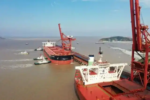 兩艘40萬(wàn)噸礦船靠泊寧波舟山港鼠浪湖礦石中轉(zhuǎn)碼頭(無(wú)人機(jī)照片)