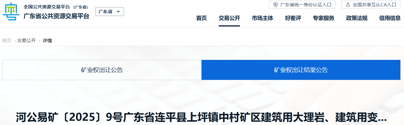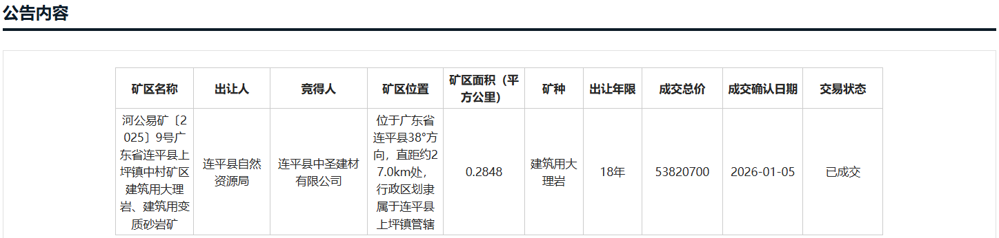 近日,廣東省公共資源交易平臺(tái)發(fā)布河公易礦〔2025〕9號(hào)廣東省連平縣上坪鎮(zhèn)中村礦區(qū)建筑用大理巖、建筑用變質(zhì)砂巖礦出讓結(jié)果公示。連平縣中圣建材有限公司以5382.07萬(wàn)元價(jià)格成功競(jìng)得該項(xiàng)目。