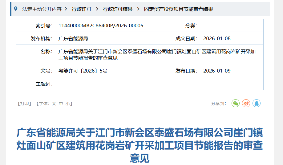 近日,廣東能源局發(fā)布江門市新會(huì)區(qū)泰盛石場(chǎng)有限公司崖門鎮(zhèn)灶面山礦區(qū)建筑用花崗巖礦開(kāi)采加工項(xiàng)目節(jié)能報(bào)告的審查意見(jiàn),擬通過(guò)審批。