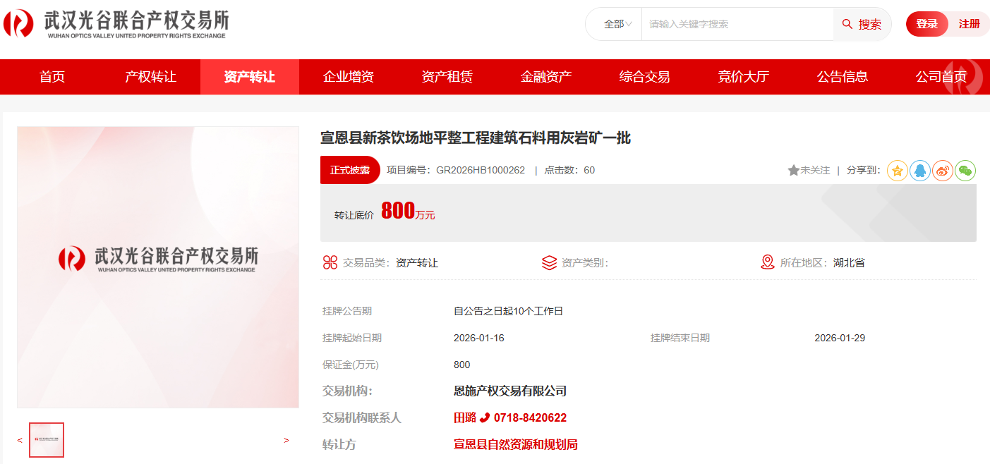 近日,武漢光谷聯(lián)合產(chǎn)權(quán)交易所發(fā)布湖北宣恩縣新茶飲場(chǎng)地平整工程建筑石料用灰?guī)r礦一批。