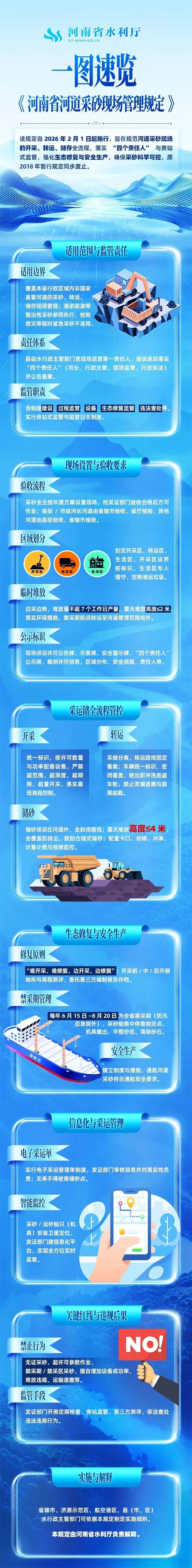 為適應(yīng)新形勢下河道采砂管理需求,進(jìn)一步規(guī)范采砂現(xiàn)場作業(yè),保障河勢穩(wěn)定、防洪安全與生態(tài)健康,河南省水利廳于近日正式印發(fā)《河南省河道采砂現(xiàn)場管理規(guī)定》(以下簡稱《規(guī)定》),并宣布該規(guī)定自2026年2月1日起施行,2018年發(fā)布的暫行規(guī)定同時(shí)廢止。