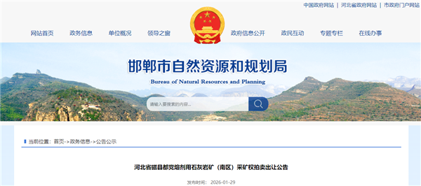 1月29日,河北省邯鄲市自然資源和規(guī)劃局發(fā)布磁縣都黨熔劑用石灰?guī)r礦(南區(qū))采礦權出讓公告,拍賣時間為2026年3月6日。該礦保有資源量超1.33億噸,擬出讓年限16年4個月(含1年基建期),起始價約1.43億元。此次公告未公布年產(chǎn)能,經(jīng)測算,礦山生產(chǎn)規(guī)模約900萬噸/年,資源價款約1.07元/噸。