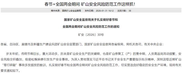 1月31日,國家礦山安全監(jiān)察局發(fā)布《關(guān)于扎實(shí)做好春節(jié)和全國兩會(huì)期間礦山安全風(fēng)險(xiǎn)防范工作的通知》,針對歲末年初節(jié)假日集中、重大活動(dòng)密集、礦山停復(fù)工集中、人員流動(dòng)頻繁、安全風(fēng)險(xiǎn)交織疊加的特點(diǎn),就強(qiáng)化風(fēng)險(xiǎn)研判、嚴(yán)格停復(fù)工管理、嚴(yán)把驗(yàn)收關(guān)口、強(qiáng)化監(jiān)管執(zhí)法等作出全面部署,堅(jiān)決防范遏制礦山生產(chǎn)安全事故,切實(shí)營造安全穩(wěn)定的生產(chǎn)環(huán)境。《通知》有效期至2026年6月30日。