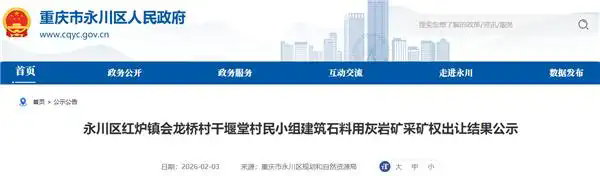 1月29日,中國建材旗下公司——中材參天(重慶)新材料有限公司成功競得永川區(qū)紅爐鎮(zhèn)會龍橋村干堰堂村民小組建筑石料用灰?guī)r礦采礦權(quán)。該礦資源儲量6167萬噸,生產(chǎn)規(guī)模180萬噸/年,起始價約2.39億元,成交價約4.67億元,溢價率約96%,折合資源價款近7.6元/噸。