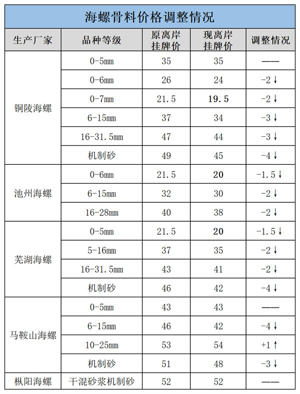 今天(2月4日),海螺水泥對長江沿線銅陵、池州、蕪湖、馬鞍山、樅陽5家工廠的骨料產品啟動新一輪調價,涉及碎石、機制砂等多類產品。 根據調價方案,銅陵海螺機制砂價格從49元/噸降至45..