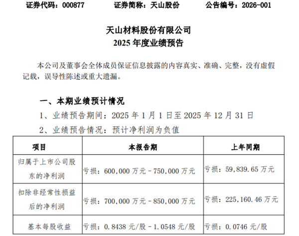 1月30日,天山材料股份有限公司發(fā)布2025年度業(yè)績預(yù)告,預(yù)計(jì)2025年歸屬于上市公司股東的凈利潤虧損60億元至75億元,而上年同期歸屬于上市公司股東的凈利潤虧損約5.98億元。