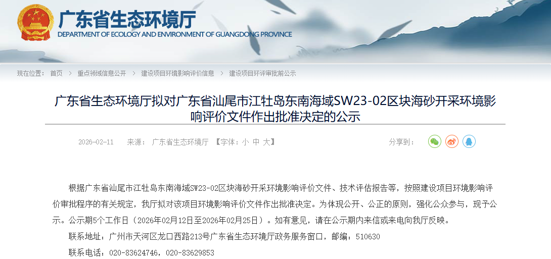 廣東省生態(tài)環(huán)境廳發(fā)布擬對廣東省汕尾市江牡島東南海域SW23-01、SW23-02區(qū)塊海砂開采環(huán)境影響評價文件作出批準決定的公示。兩塊礦區(qū)可采海砂儲量超2842.82萬方,年產可達1300萬方。