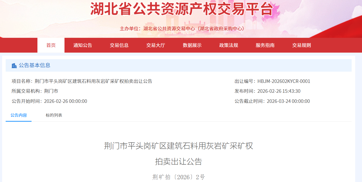 近日,湖北省公共資源產(chǎn)權(quán)交易平臺(tái)掛牌出讓荊門市平頭崗礦區(qū)建筑石料用灰?guī)r礦采礦權(quán)。該采礦權(quán)資源量建筑石料用灰?guī)r9634.1萬噸,方解石29.6萬噸,設(shè)計(jì)生產(chǎn)規(guī)模400萬噸/年,服務(wù)年限20年,拍賣起始價(jià)為9655萬元。
