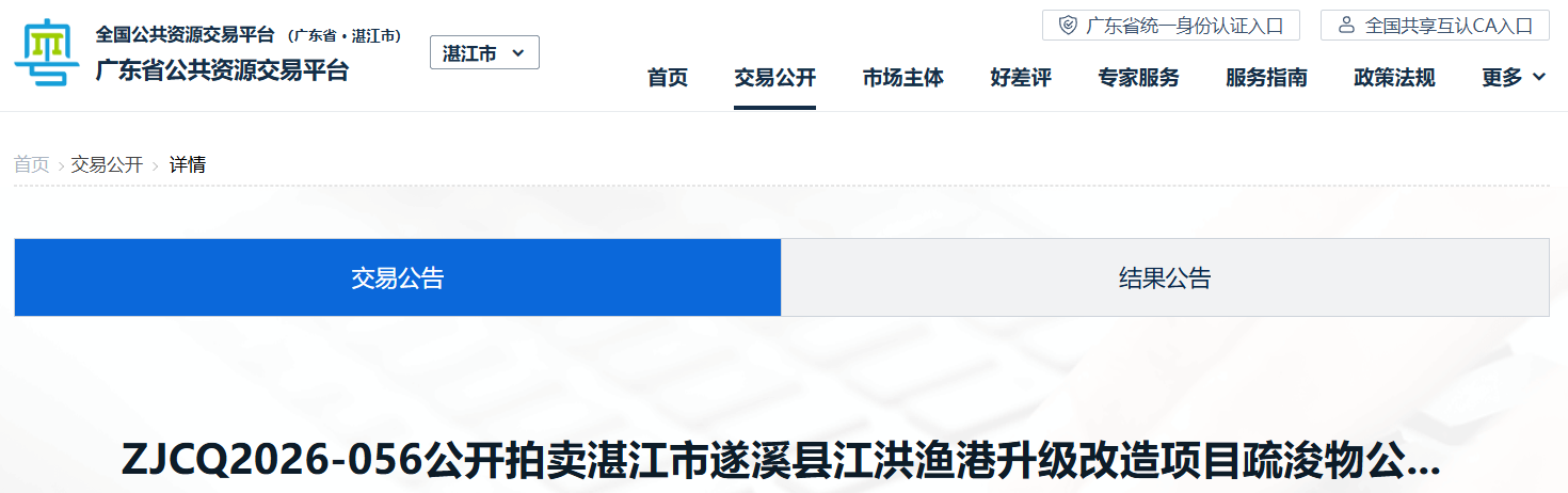 近日,廣東省公共資源交易平臺發(fā)布公開拍賣湛江市遂溪縣江洪漁港升級改造項目疏浚物公告。