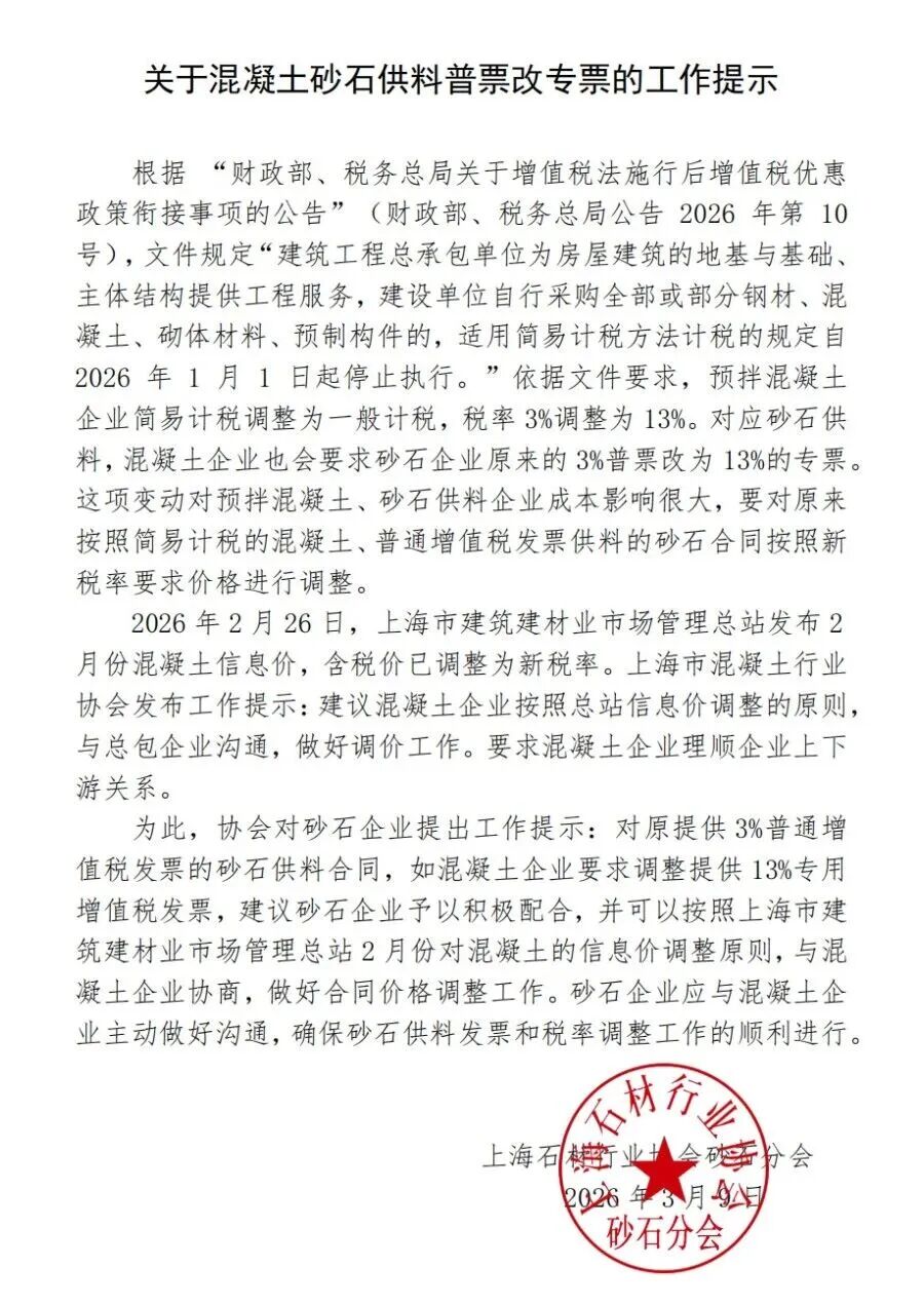 3月9日,上海石材行業(yè)協(xié)會(huì)砂石分會(huì)發(fā)布關(guān)于混凝土砂石供貨普票改專票的工作提示,明確提出:針對(duì)原提供3%增值稅普通發(fā)票的砂石供貨合同,若混凝土企業(yè)要求調(diào)整為13%增值稅專用發(fā)票,建議砂石企業(yè)積極配合,并參照上海市建筑建材業(yè)市場管理總站2月份混凝土信息價(jià)的調(diào)整原則,與混凝土企業(yè)協(xié)商做好合同價(jià)格調(diào)整工作。