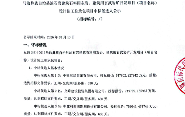 3月10日,中國招投標(biāo)公共服務(wù)平臺(tái)發(fā)布四川省樂山市馬邊彝族自治縣油石巖建筑石料用灰?guī)r、建筑用玄武巖礦開發(fā)項(xiàng)目(項(xiàng)目名稱)設(shè)計(jì)施工總承包項(xiàng)目中標(biāo)候選人公示,服務(wù)期630天。