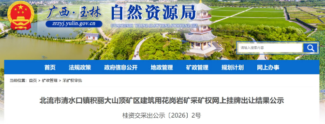近日,廣西玉林市自然資源局發(fā)布北流市清水口鎮(zhèn)積麗大山頂?shù)V區(qū)建筑用花崗巖礦采礦權(quán)網(wǎng)上掛牌出讓結(jié)果公示。該礦資源儲(chǔ)量共計(jì)3728.93萬噸,生產(chǎn)規(guī)模共計(jì)271.89萬噸/年,出讓期限為14年(含基建期約1年),起始價(jià)9500萬元,成交價(jià)31550萬元,溢價(jià)率達(dá)232%,單價(jià)8.46元/噸。競得人北流市永興礦業(yè)有限公司為國有企業(yè)。