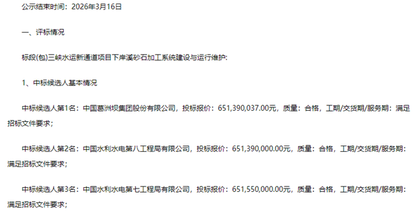3月13日,三峽水運(yùn)新通道項(xiàng)目下岸溪砂石加工系統(tǒng)建設(shè)與運(yùn)行維護(hù)項(xiàng)目正式公示中標(biāo)候選人,公示期至3月16日結(jié)束。本次中標(biāo)候選人均為行業(yè)頭部央企,其中第一中標(biāo)候選人為中國(guó)葛洲壩集團(tuán)股份有限公司,第二中標(biāo)候選人為中國(guó)水利水電第八工程局有限公司,第三中標(biāo)候選人為中國(guó)水利水電第七工程局有限公司,三家企業(yè)投標(biāo)報(bào)價(jià)均突破6.51億元。