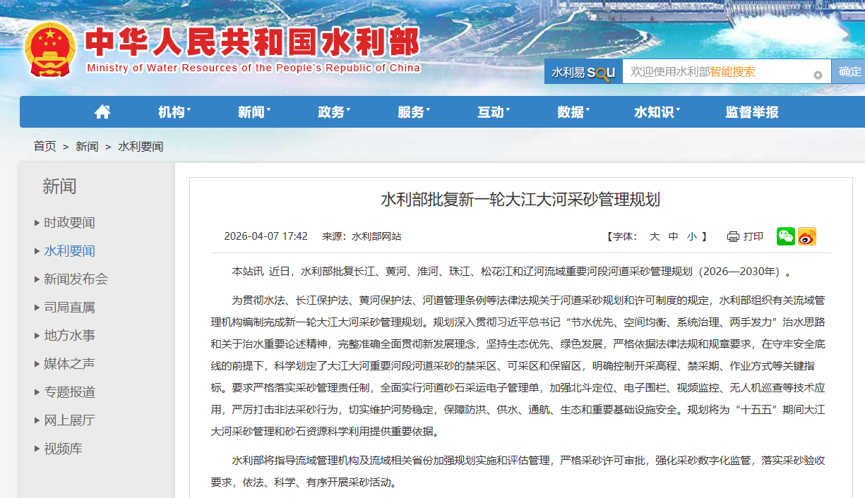 近日,水利部批復(fù)長(zhǎng)江、黃河、淮河、珠江、松花江和遼河流域重要河段河道采砂管理規(guī)劃(2026—2030年),劃定大江大河重要河段河道采砂的禁采區(qū)、可采區(qū)和保留區(qū),明確控制開(kāi)采高程、禁采期、作業(yè)方式等關(guān)鍵指標(biāo)。全面實(shí)行河道砂石采運(yùn)電子管理單,加強(qiáng)北斗定位、電子圍欄、視頻監(jiān)控、無(wú)人機(jī)巡查等技術(shù)應(yīng)用,嚴(yán)厲打擊非法采砂行為。