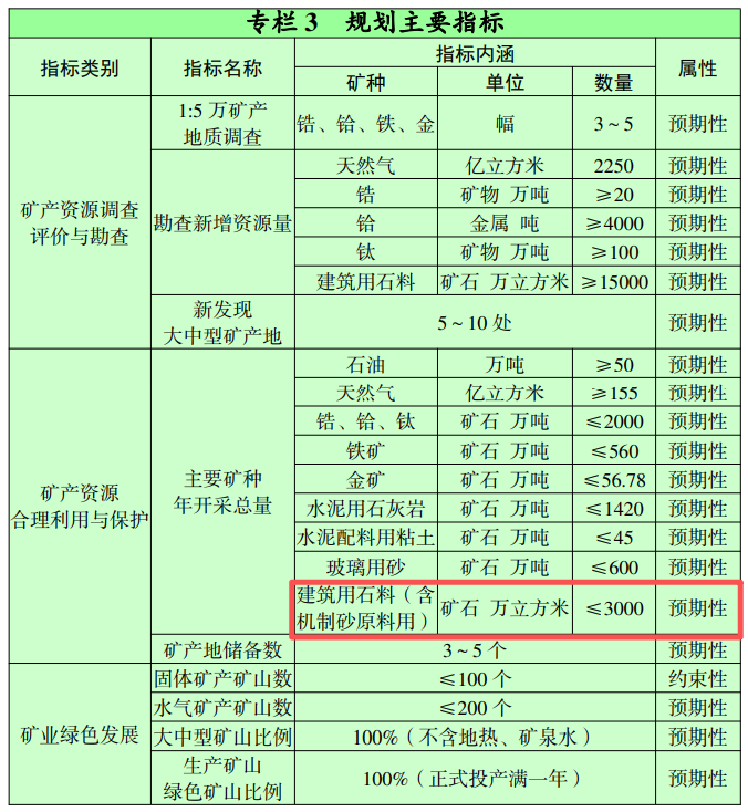 調控開采總量。按省級及以下管理權限,以保障建材礦產資源為主,全省建筑石料年開采量原則上不超過3000萬立方米。