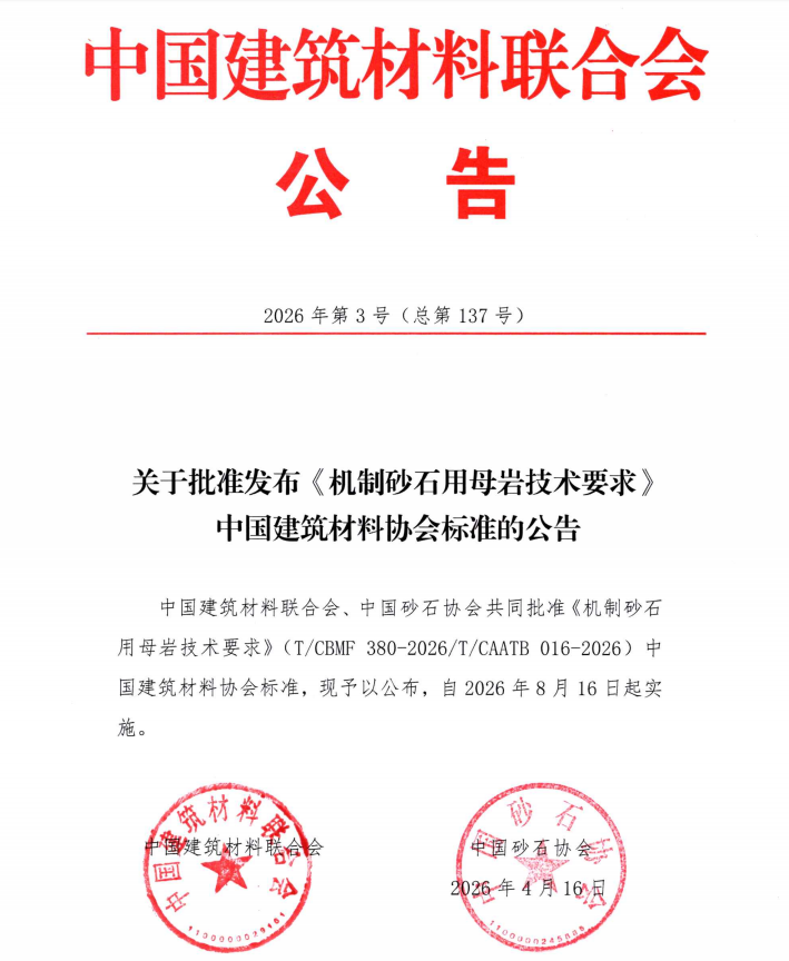 近日,中國建筑材料聯合會、中國砂石協會聯合發布公告,共同批準《機制砂石用母巖技術要求》(T/CBMF 380-2026/T/CAATB 016-2026)中國建筑材料協會標準,該標準將于2026年8月16日起正式實施。作為我國機制砂石行業首部聚焦源頭原料的專項技術標準,它的實施標志著我國機制砂石產業從原料遴選到生產應用的全鏈條標準體系進一步完善,為行業高質量發展筑牢根基。